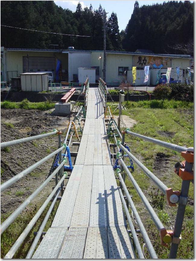 | この「仮橋」を行きます。 ワタシ人並みに「高所恐怖」はありますが、「低い」ところなら、少々「揺れたり」するほうが「楽しい」ひとなので、ホイホイ進みます。 |