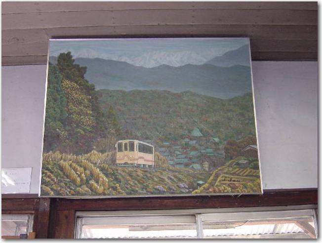 壁には「絵」がかかっています。 なんとかいう (失礼 ! ) 「画伯」ではなく、「元運転士さん」の作品だそうです。 旧型車両の「アケチ1形」が描かれています。 |